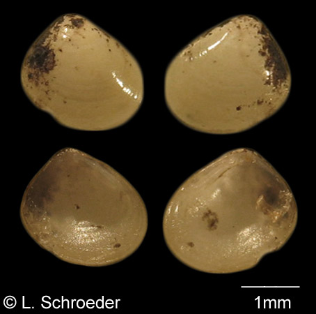 This tiny species has a highly polished periostracum. The umbones are frequently covered in dark deposits.
