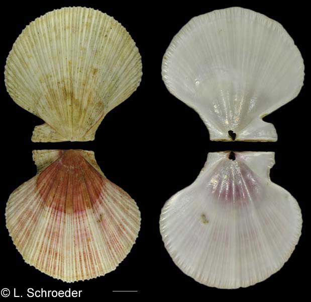 Chlamys albida (Arnold, 1906)White Scallopsubtidal, 100-200m size to 65mmcentral to northern Alaska, across Bering Sea and south to northern JapanThe shell is white to pink and sometimes is banded. There are 6-12 wide undulations, with numerous imbricated ribs on and between the undulations. It was once considered to be Chlamys islandica, but that is an Atlantic species.(previous names - Pecten hastatus albidus, Pecten erythrocomatus)