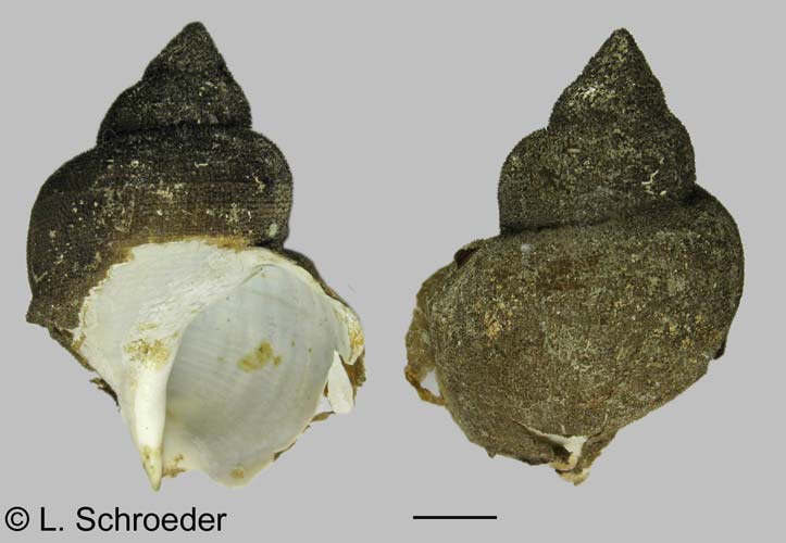 This species has a distinctive, thin, bumpy periostracum.