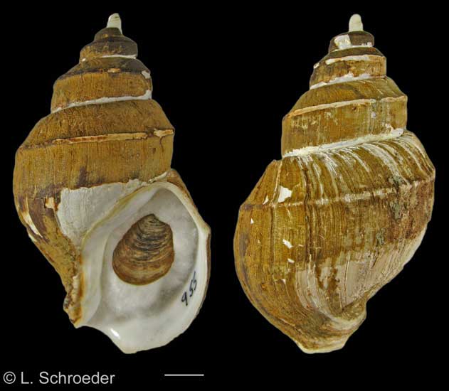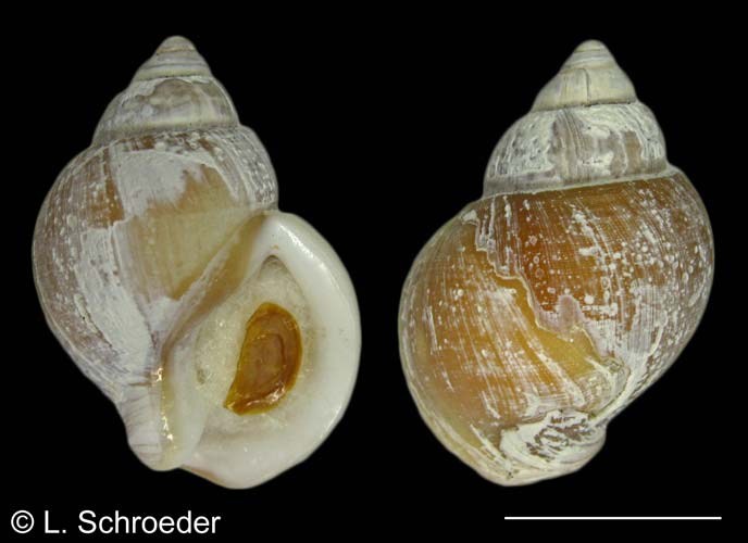 This species has a large body whorl and a yellowish operculum.