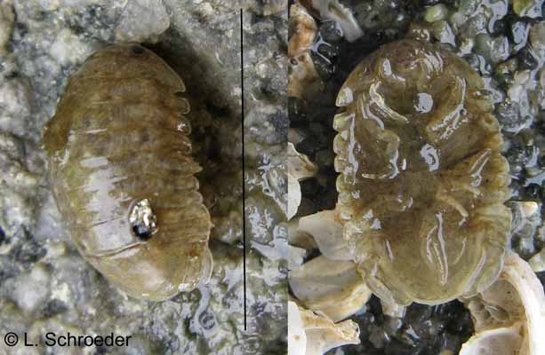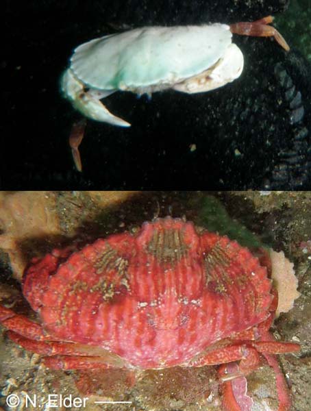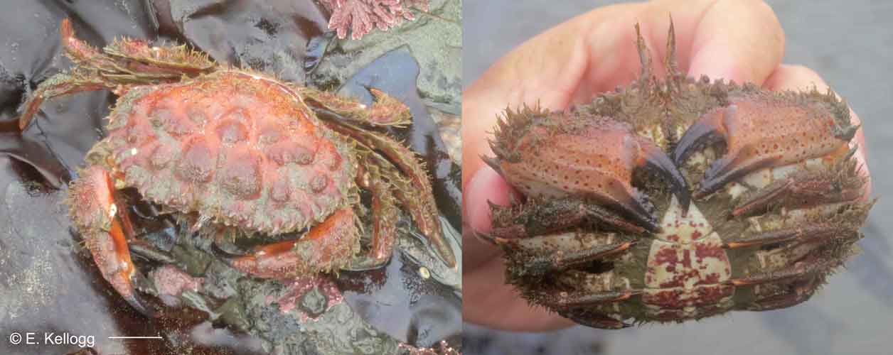 Very rarely intertidal, greenish-gray to reddish, carapace and legs covered in scale-like plates