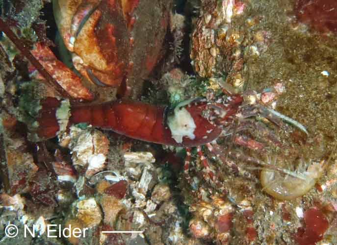 legs, claw tips are black, found under rocks or in empty giant barnacle