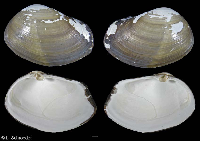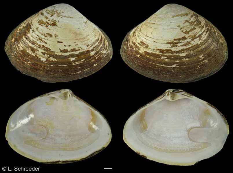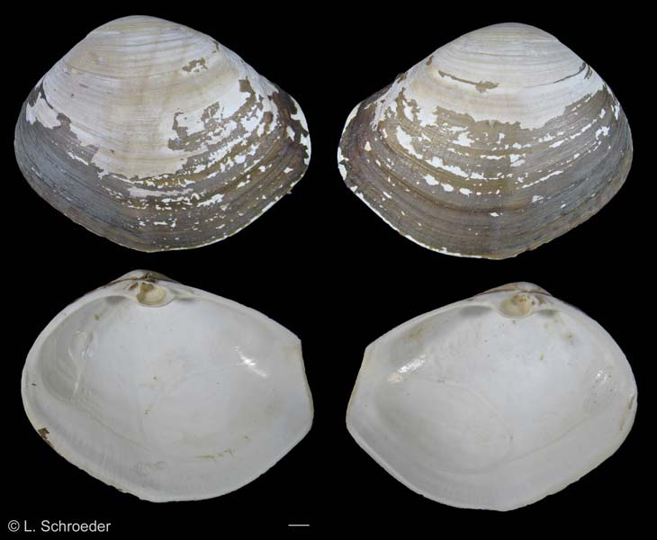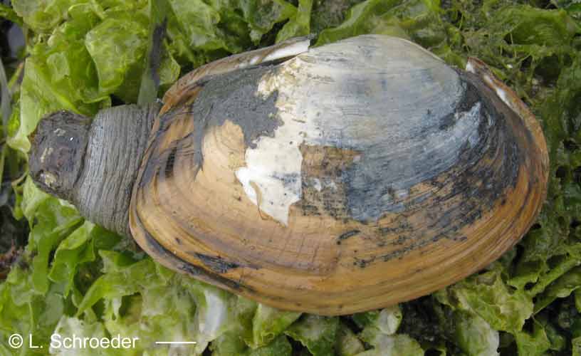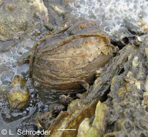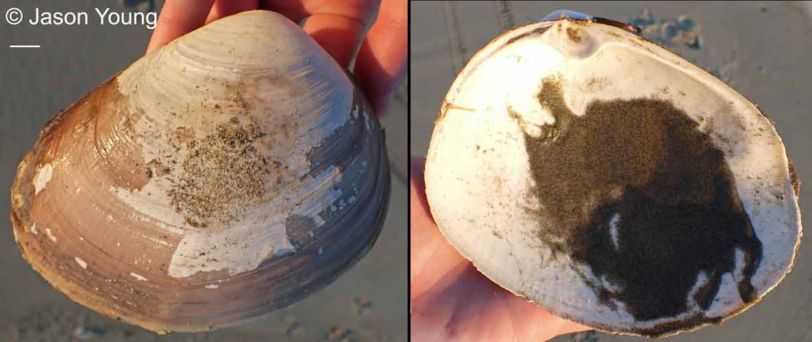 This is occasionally found intertidally in its southern range and commonly found to the north. It prefers a muddy location. The periostracum is dark, shiny, and rough, and tends to be worn away near the hinged end of the shell.