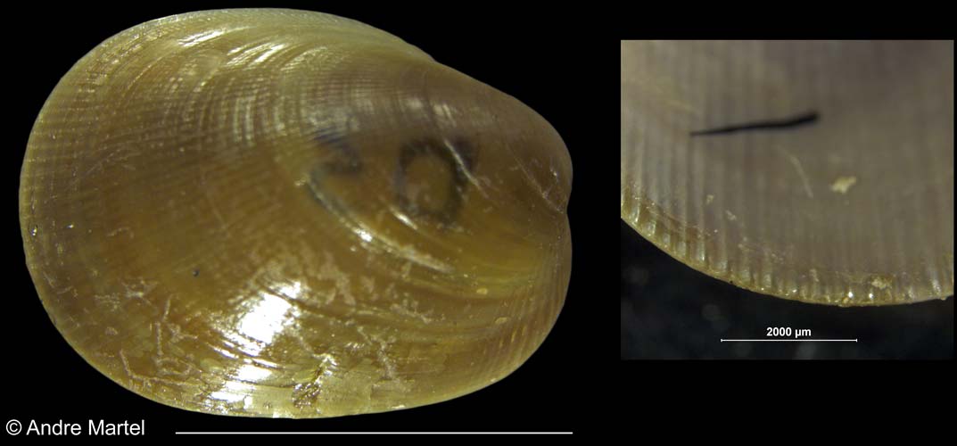 This shell is inflated and has very fine radial and irregular, commarginal lines.