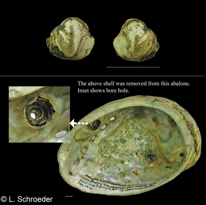 shell is infrequently found. It bores into Abalone shells and