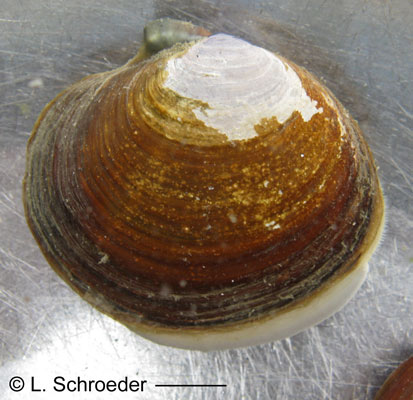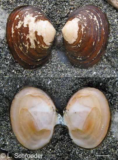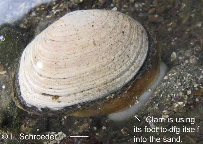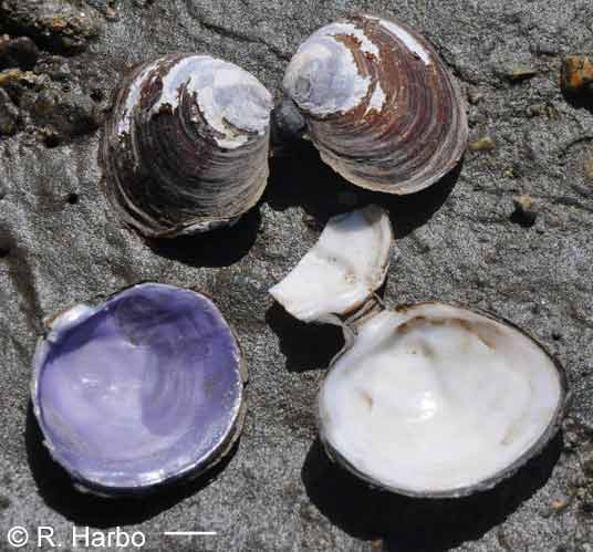 This is commonly found intertidally. It was originally introduced to BC and has now spread to southern Puget Sound and along the outer coast. It is considered invasive. The shell is thin, with a dark, shiny periostracum. The interior is dark purple. Shells with an orange or white interior can sometimes be found. It is a popular food clam in some areas.