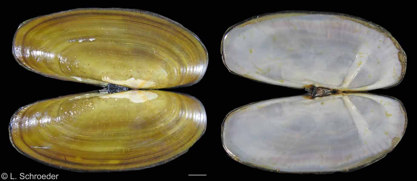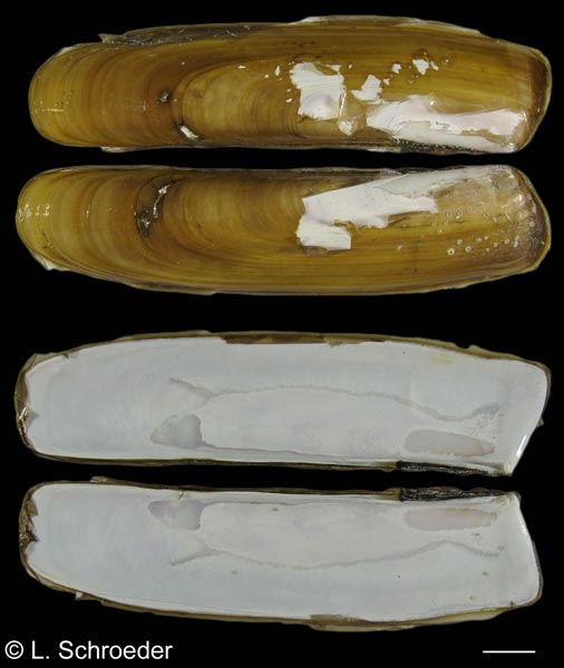 highly polished periostracum. Its internal rib is angled.