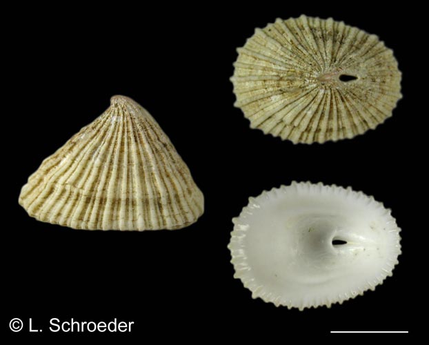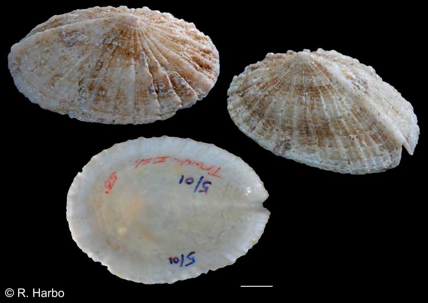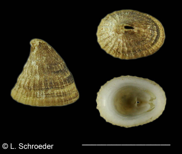 It is only found subtidally and then very rarely.  It has regular radial ribs and a small slit on the anterior side.  The apex curves toward the posterior.