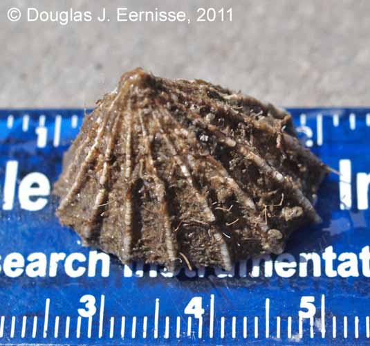This is common subtidally but fairly rare to find intertidally.  It's widely spaced ribs are distinctive from our other local species.  The ribs extend to the basal edge.