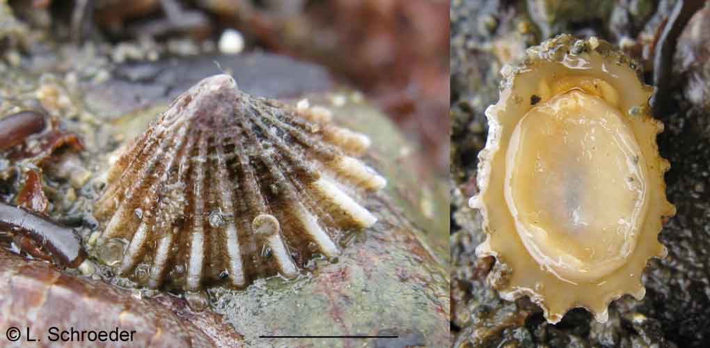 This is not commonly seen intertidally.  It has smaller and more closely spaced ribs than C. cucullata.  The basal edge is smooth.  The interior structure behind the slit forms a semi-circle.